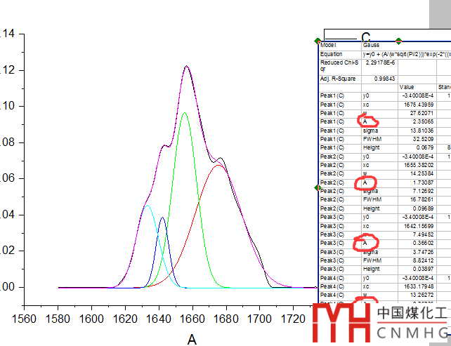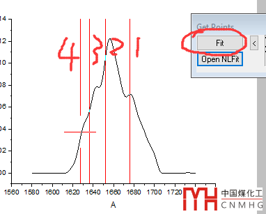 在曲線上單擊鼠標(biāo)查看位置,雙擊設(shè)定峰位置。將酰胺I帶分成4個峰,分別對應(yīng)beta折疊(1627),無序結(jié)構(gòu)(1636),alpha螺旋(1652)和beta折疊(1676)。點(diǎn)擊Fit擬合。