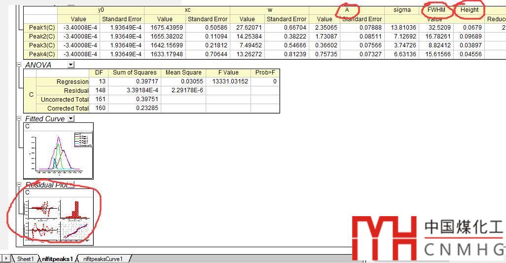 擬合結(jié)果也可以在數(shù)據(jù)表中查看,包括峰面積、半峰寬、峰高及殘差等。
