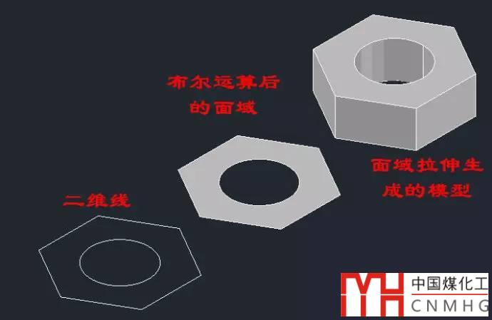 面域作為一個面,需要先繪制一個封閉的邊界,邊界可以是由直線、圓弧、多段線等圖形組成,原則就是封閉且不交叉??梢砸淮芜x擇多個封閉線條生成多個面域,例如上圖中可以同時選中六邊形和圓生成面域,但生成是兩個獨立的面域,必須經(jīng)過布爾運算才能得到中空的面域圖形。