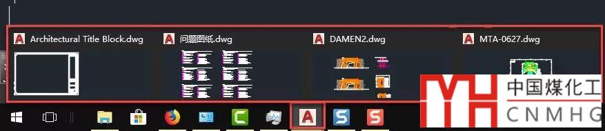 在高版本W(wǎng)INDOWS操作系統(tǒng)中,如果CAD打開(kāi)多個(gè)文件時(shí),在狀態(tài)欄可以切換文檔窗口,如下圖所示。