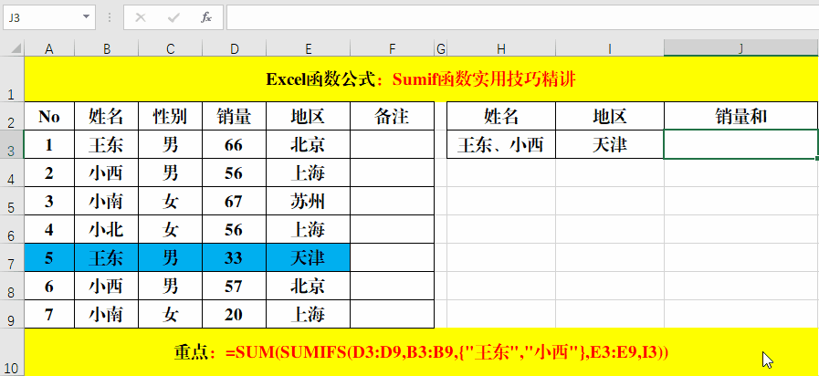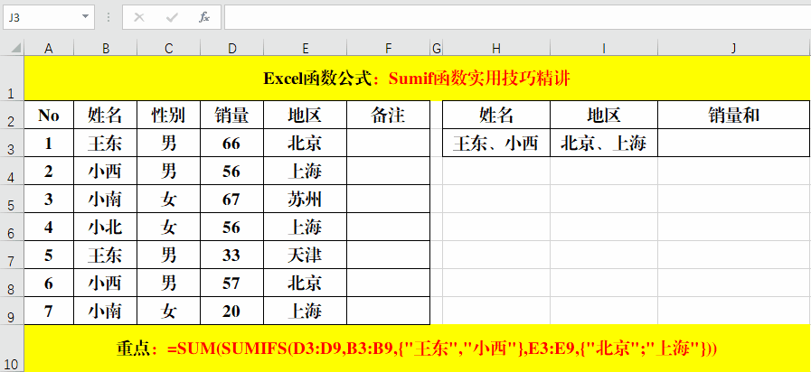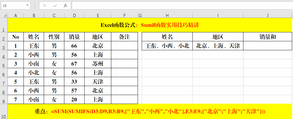 2、公式=SUM(SUMIFS(D3:D9,B3:B9,{"王東","小西"},E3:E9,{"北京";"上海"}))中第一個(gè)條件{"王東","小西"}中間的分隔符為逗號(hào)(,),而第二個(gè)條件{"北京";"上海"}中間的分隔符為分號(hào)(;)原因在于“北京”和“上海”這兩個(gè)條件“王東和小西”都要用到。大家在學(xué)習(xí)的時(shí)候要注意理解哦!