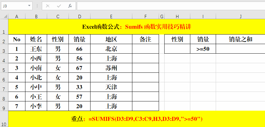 目的:求“男”、“女”銷售員銷量大于等于50的銷量和。