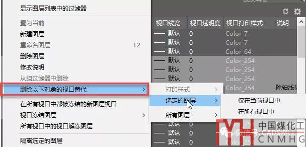 其實(shí)CAD提供視口替代特性的同時(shí)就考慮到了這個(gè)問題,在圖層管理器的右鍵菜單中提供了不同的選項(xiàng),可以刪除選定圖層在當(dāng)前視口或所有視口的替代特性,或者直接刪除所有圖層在當(dāng)前市口苦或所有視口的替代特性,如下圖所示。