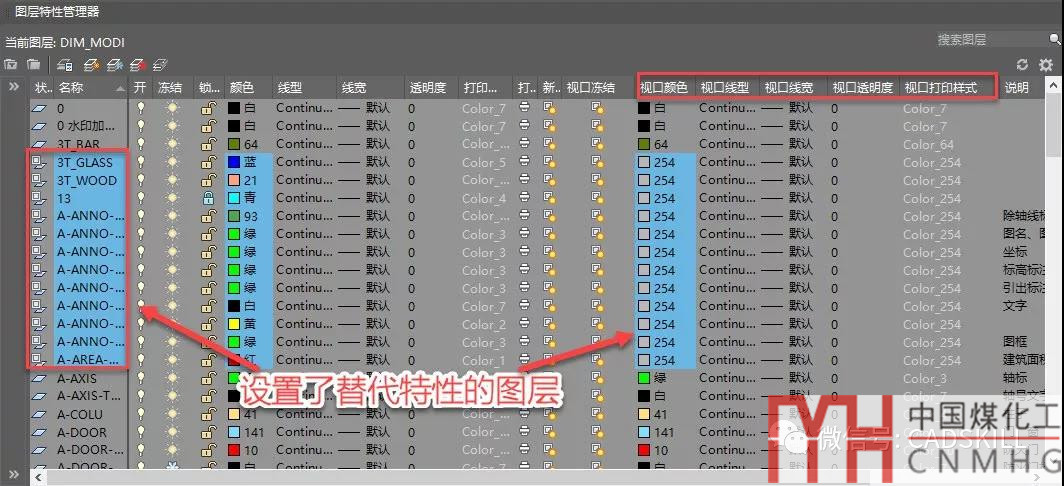 關(guān)于圖層視口凍結(jié)和視口替代特性在之前的文章其實(shí)就介紹過(guò),設(shè)置了替代特性的圖層名和替代特性都會(huì)顯示藍(lán)底,前面表示圖層狀態(tài)的圖標(biāo)也不一樣,如下圖所示。