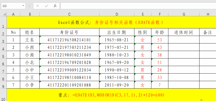2、此處的計(jì)算規(guī)則為:男工作60年退休,女50年退休。首先用Mod函數(shù)判斷性別,如果為“男”,則在出生日期的基礎(chǔ)上加上1*120+600=720個(gè)月,也就是60年。如果為“女”,則在出生日期的及出生加上0*120+600=600個(gè)月,也就是50年。