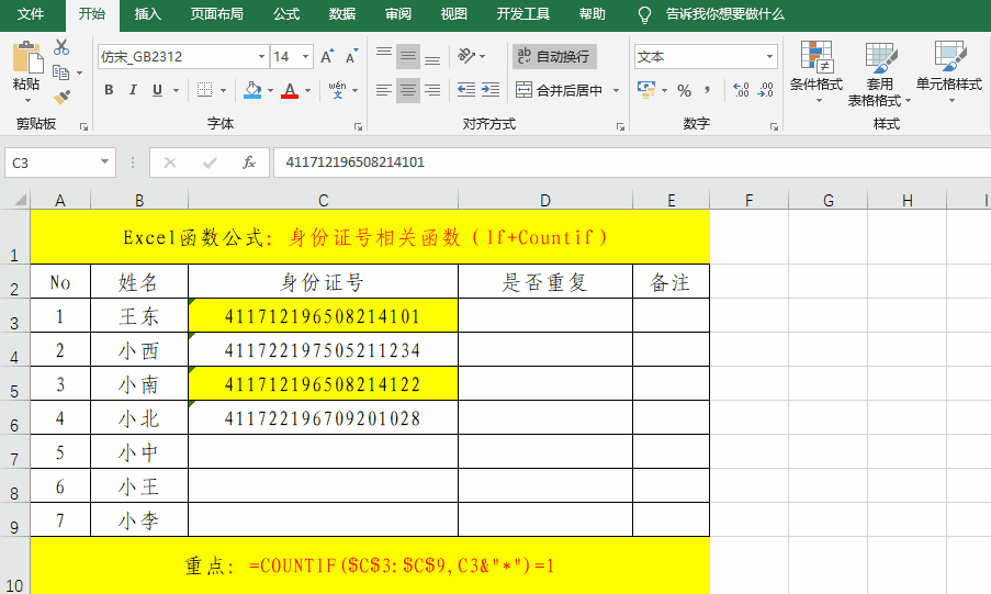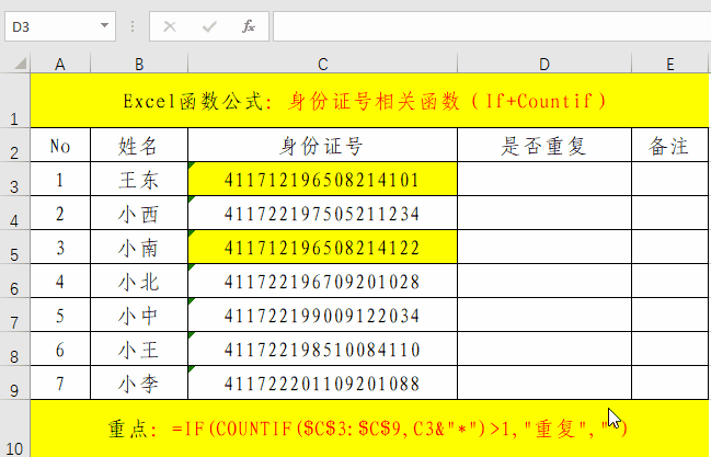 在目標(biāo)單元格中輸入公式:=IF(COUNTIF($C$3:$C$9,C3)>1,"重復(fù)","")。