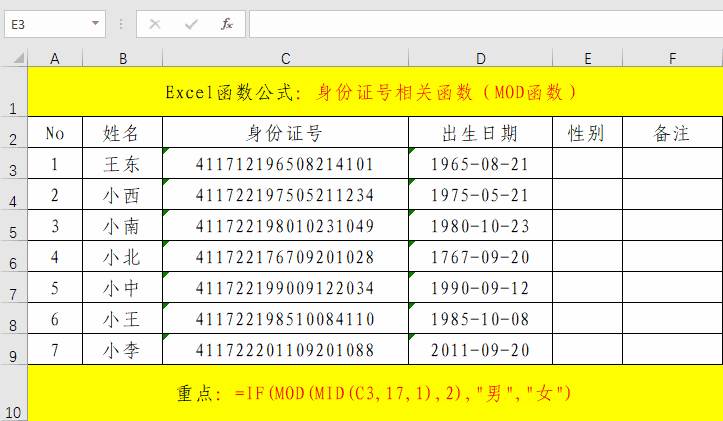 3、用If函數(shù)判斷求模取余的結(jié)果,如果為奇數(shù),返回“男”,如果為偶數(shù),返回“女”。