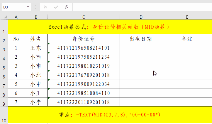 在目標(biāo)單元格中輸入公式:=TEXT(MID(C3,7,8),"00-00-00")。