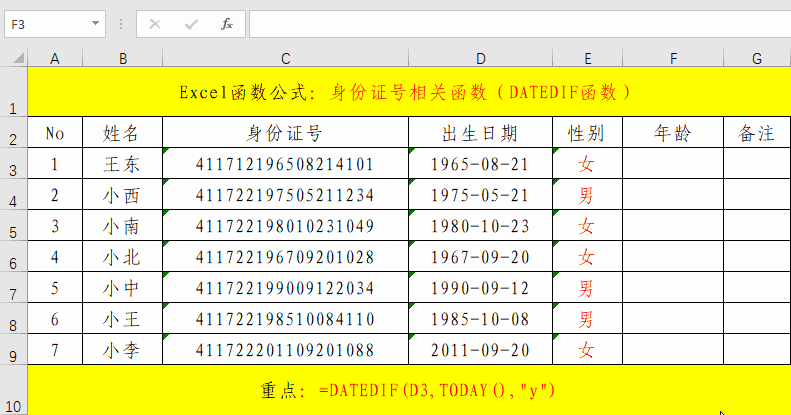 Datedif函數(shù)為系統(tǒng)隱藏函數(shù),其功能為按照指定的方式統(tǒng)計(jì)兩個(gè)時(shí)間之間的差。其語(yǔ)法結(jié)構(gòu)為:=Datedif(開(kāi)始時(shí)間,結(jié)束時(shí)間,統(tǒng)計(jì)方式)。其中公式中用到的統(tǒng)計(jì)方式“y”指的是按“年”進(jìn)行計(jì)算。