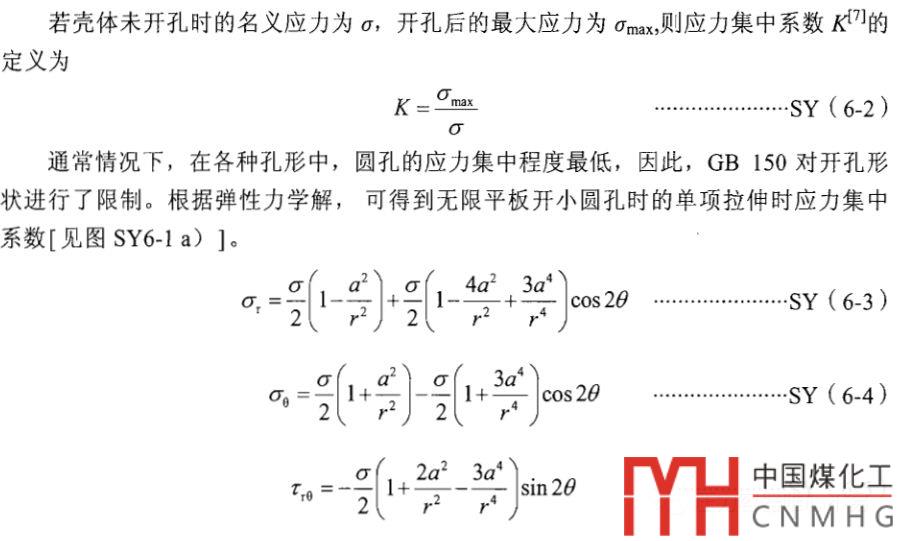 對于筒體開孔來說,如果知道應(yīng)力集中系數(shù)大約是多少,那么通過求筒體上的不開孔部位的膜應(yīng)力,乘以應(yīng)力集中系數(shù),就能得到開孔處的最大應(yīng)力。