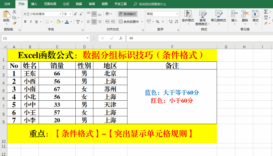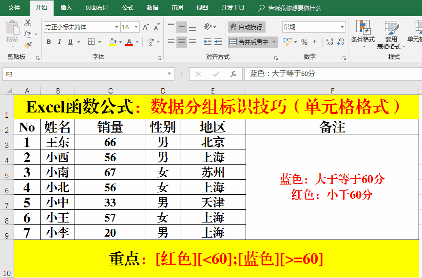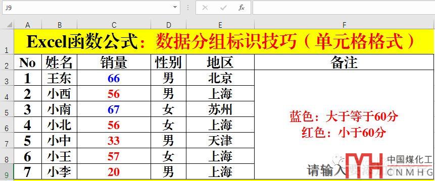 對于銷售員的銷售額,大于等于60的自動用藍(lán)色字體顯示。小于60的自動用紅色字體顯示。