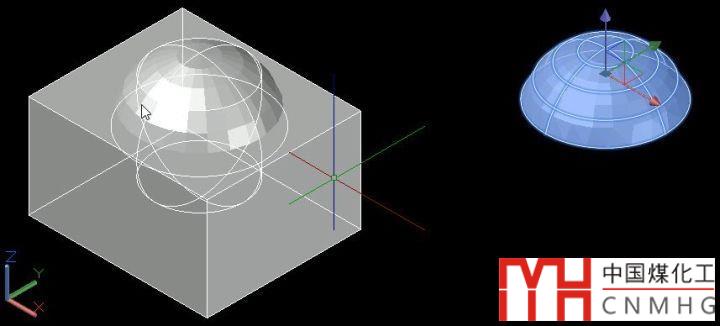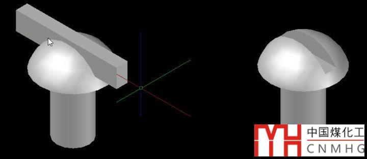 比如這樣一個(gè)螺釘?shù)哪P?,就可以用基本圖元中的球體、圓柱、方體來創(chuàng)建,首先我們創(chuàng)建一個(gè)球體,然后可以創(chuàng)建一個(gè)方體將球體下面減掉(SUBTRACT),或者創(chuàng)建一個(gè)方體跟球體求交集(INTERSECT),保留球體的上面一部分,這樣得到螺釘?shù)捻敹?,如下圖所示。
