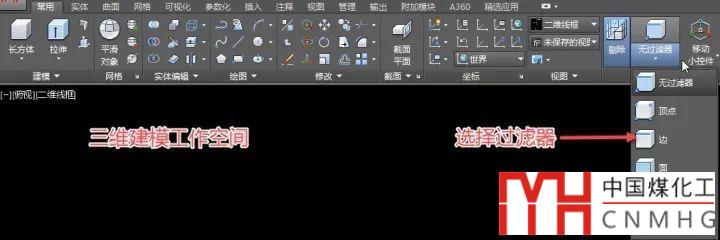 可以在多個三維功能區(qū)選項卡的“選擇”面板中找到,該過濾器指定在單擊三維對象時選定的默認子對象。如果無過濾器處于選定狀態(tài),將選擇整個對象。