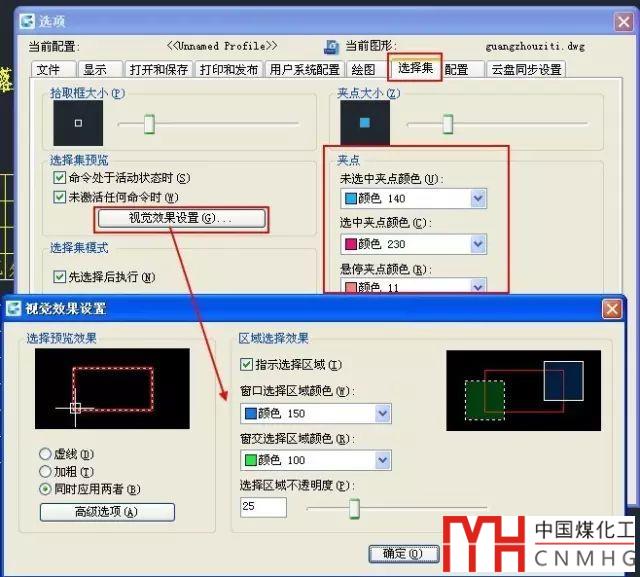 上面介紹了模型空間和布局空間背景顏色的設(shè)置方法,CAD很多界面元素的顏色都可以用上述方法設(shè)置,例如十字光標(biāo)、柵格線的顏色等。但還有一些界面元素的顏色不是在“圖形窗口顏色”對(duì)話框設(shè)置的,例如交叉和窗口(左右)框選的顏色、夾點(diǎn)的顏色就在選項(xiàng)對(duì)話框的“選擇集”選項(xiàng)卡中設(shè)置,如下圖所示。