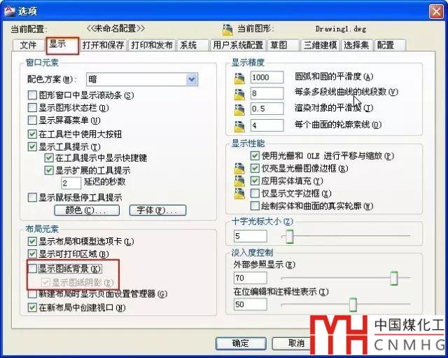 我們看到只有中間部分變黑了,背景顏色并沒(méi)有變,在選項(xiàng)對(duì)話框的顯示選線卡中,單擊取消勾選“顯示圖紙背景”,如下圖所示,然后單擊確定按鈕關(guān)閉選項(xiàng)對(duì)話框。