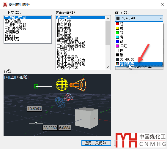 進(jìn)來(lái)后默認(rèn)選項(xiàng)就是二維模型空間的背景顏色,只需要在右上角的顏色下拉列表中選擇需要的顏色就好了。如果列表中的幾種顏色不滿足要求,可以點(diǎn)最下面的“選擇顏色”,就會(huì)彈出選擇顏色對(duì)話框,如下圖所示。