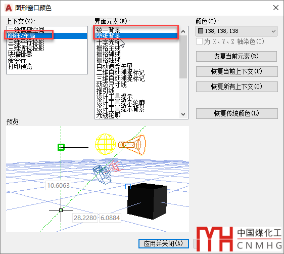 在“圖形窗口顏色”對(duì)話框點(diǎn)“應(yīng)用并關(guān)閉”按鈕,這時(shí)雖然選項(xiàng)對(duì)話框沒(méi)有關(guān)閉,但我們已經(jīng)能看到設(shè)置的效果,如果不合適,可以接著改,如何沒(méi)有問(wèn)題,可以點(diǎn)“確定”按鈕關(guān)閉選項(xiàng)對(duì)話框。