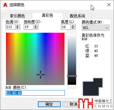 彈出的是一個(gè)標(biāo)準(zhǔn)的選擇顏色對(duì)話框,但與設(shè)置圖層或?qū)ο髮傩詴r(shí)不同的是,設(shè)置圖層和對(duì)象屬性時(shí)默認(rèn)打開(kāi)的是索引顏色選項(xiàng)卡,而設(shè)置背景顏色的時(shí)候默認(rèn)顯示的是真彩色選項(xiàng)卡。在對(duì)話框中我們可以直接輸入顏色的色調(diào)、飽和度、亮度值,也可以在地下直接輸入顏色的RGB值,或者直接用光標(biāo)在樣板上點(diǎn)取需要的顏色,設(shè)置好有點(diǎn)“確定”即可。