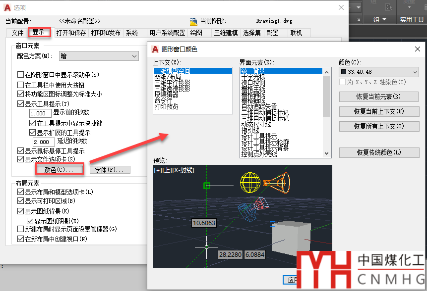 CAD各版本的背景顏色不是一成不變的,早期版本模型空間默認(rèn)背景顏色是黑色,到高版本模型空間顏色稍微變淺了一些。而且CAD為了適應(yīng)不同用戶的需求,提供了越來(lái)越多自定義顏色的選項(xiàng),反而讓簡(jiǎn)單的事情復(fù)雜化了,面對(duì)“選項(xiàng)”對(duì)話框中繁復(fù)的參數(shù),“圖形窗口顏色”對(duì)話框中幾個(gè)列表,很多初學(xué)者反倒不知如何下手了。
