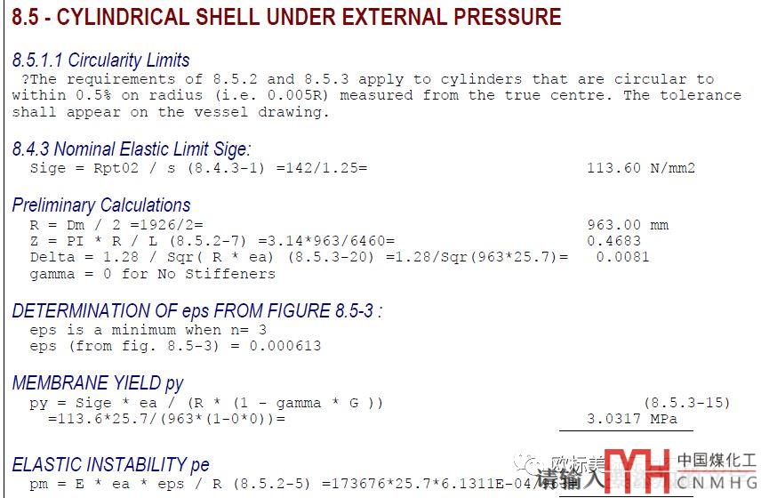 EN13445的計算方法簡單的說分四步:1)直接采用Mises公式計算得到理論許用外壓Pm--環(huán)向壓縮;2) 取材料正好發(fā)生屈服時的外壓力為Py;3)實際許用外壓為Pr,則Pr/Py = σ/σy ; 4)在曲線上可直接查得Pr/Py