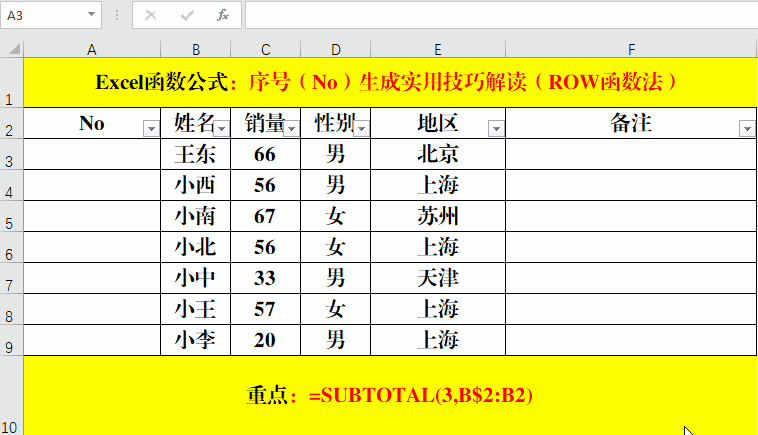 目的:用SUBTOTAL生成序號(No),保證篩選數(shù)據(jù)后序號(No)的連續(xù)性。
