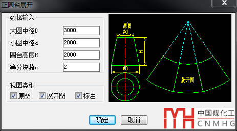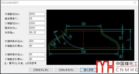 為了方便用戶能夠直接獲得展開圖,VCAD2018增加了雙折邊錐體展開的程序??梢酝ㄟ^L或者半頂角a來確定錐體??梢酝ㄟ^L求a,也可以通過a求L,非常方便定義尺寸。