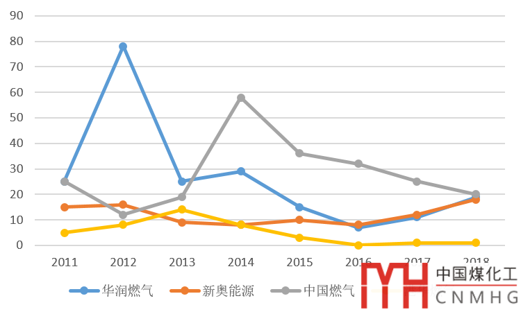 2011-2018年四大城燃集團(tuán)新增項(xiàng)目數(shù)