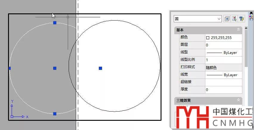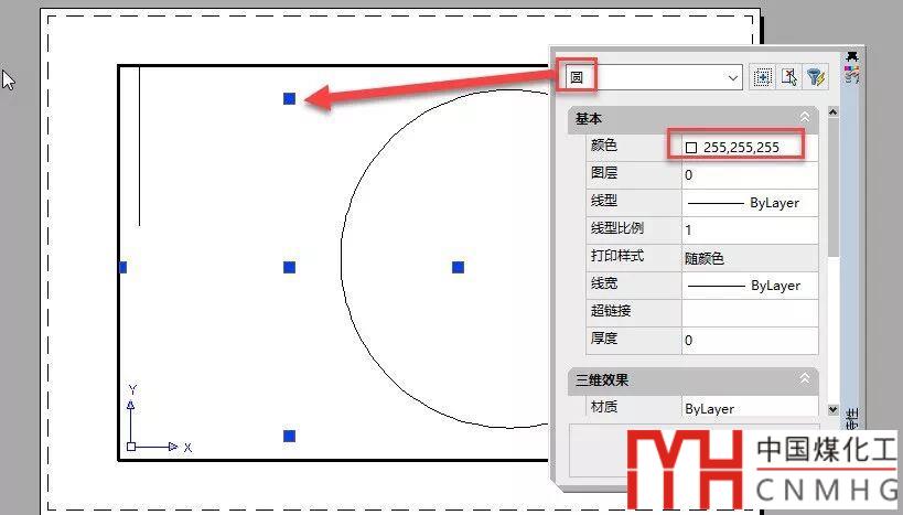 可以看到設(shè)置成真彩色255,255,255的圓雖然看不到,但可以選中,圖形并沒(méi)有顯示,只是看不到了,如果我們把視口移到非白色背景的區(qū)域或?qū)⒉季直尘霸O(shè)置成非白色,這個(gè)圓就可以看到了,如下圖所示。