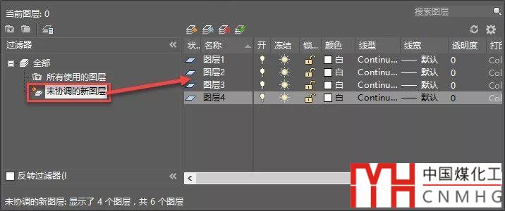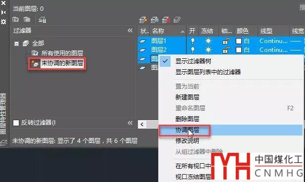 在圖層管理器中選擇“未協(xié)調(diào)圖層”過濾器,右側(cè)顯示的就都是新圖層,在右側(cè)列表選擇一個或多個圖層后,右鍵,在右鍵菜單中選擇“協(xié)調(diào)圖層”就可以讓圖層不再是未協(xié)調(diào)圖層,如下圖所示。