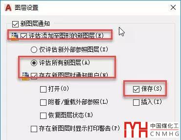 但為了更簡單的重現(xiàn)現(xiàn)象,我們單選“評估所有新圖層”,然后打開“存在新圖層時通知用戶”并勾選“保存”,如下圖所示。