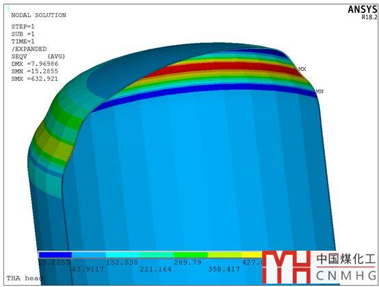 下圖是碟形封頭在內(nèi)壓作用下的應(yīng)力云圖: