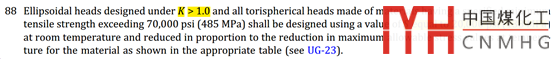 所以ASME規(guī)定,對于所有的碟形封頭和K>1的橢圓形封頭(就是比較扁的橢圓封頭),都需要降低許用應(yīng)力使用。