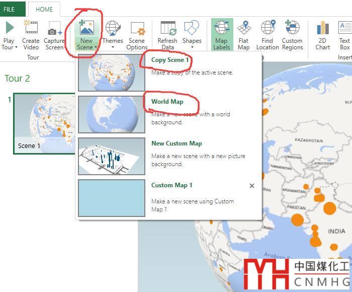 添加場景(scene)。和powepoint有點(diǎn)相似,powermap里可以添加等多個場景,也可以放映,還能導(dǎo)出為視頻!添加場景里有多個選項(xiàng),可以復(fù)制前一個,或者新建一個。