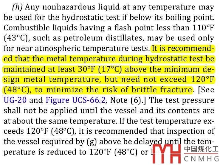 在ASME中,對(duì)水壓試驗(yàn)液體溫度為MDMT+17°C,且不超過(guò)48°C,以減小脆性破壞的危險(xiǎn)。