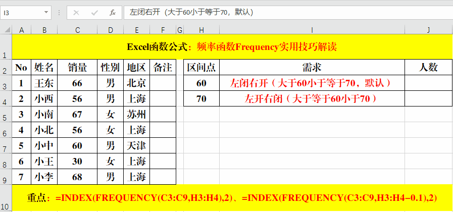 1、區(qū)間點{60,70},函數(shù)Frequency的默認統(tǒng)計方式為“左閉右開”,暨統(tǒng)計值時默認的方式為“大于60小于等于70”,不包含60,包含70。