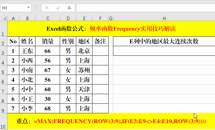 1、在目標(biāo)單元格中輸入公式:=MAX(FREQUENCY(ROW(3:9),IF(E3:E9<>E4:E10,ROW(3:9))))。