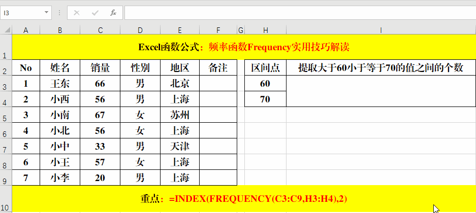 1、公式=Frequency(C3:C9,H3:H4)的統(tǒng)計結(jié)果為小于等于60分的結(jié)果和大于60分小于等于70分的兩個結(jié)果。