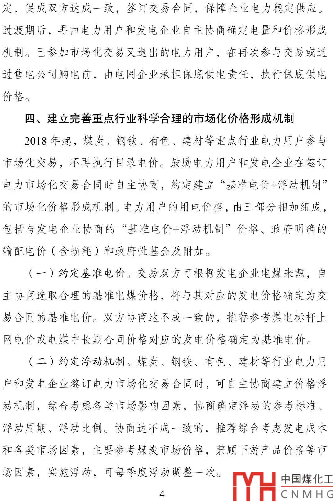 (二)協(xié)商建立“基準(zhǔn)電價(jià)+浮動(dòng)機(jī)制”的市場(chǎng)化定價(jià)機(jī)制,基準(zhǔn)電價(jià)可以參考現(xiàn)行目錄電價(jià)或電煤中長(zhǎng)期合同燃料成本及上年度市場(chǎng)交易平均價(jià)格等,由發(fā)電企業(yè)和電力用戶、售電企業(yè)自愿協(xié)商或市場(chǎng)競(jìng)價(jià)等方式形成。