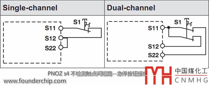 PNOZ s4的兩路安全通道,可以連接成單通道型(不帶觸點間短路檢測)或者雙通道型;雙通道型又可以分為帶觸點間短路檢測型和不帶觸點間短路檢測型;下圖是不帶觸點間短路檢測的急停按鈕接線方法: