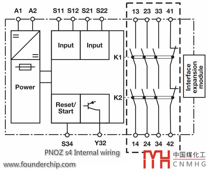 PNOZ s4的供電電壓有24V DC(訂貨號:750104、751104、751184)和220V AC(訂貨號:750134、751134)兩種,可以根據(jù)項目的需要來選擇。每一種產品均有兩路安全通道;三路安全常開觸點和一路輔助常閉觸點;下面這張圖,是PNOZ s4(DC 24V)的內部線路圖:
