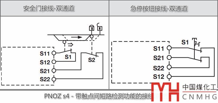 下圖是帶觸點間短路檢測的安全門及急停按鈕的雙通道接線原理圖: