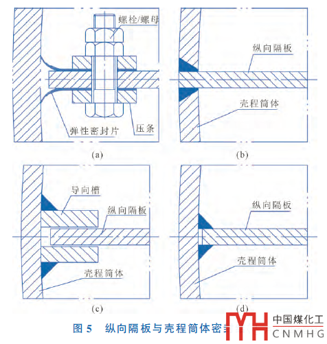 GB/T 151的6.8.4介紹了4種縱向隔板與殼程筒體的密封,其中兩種為可拆式連接,另外兩種為焊接連接。