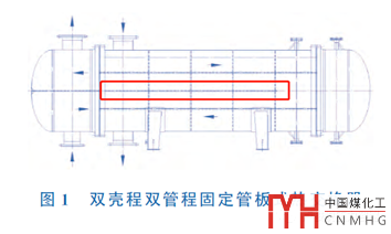 圖1、圖2分別為固定管板式、U形管式雙殼程換熱器。殼程縱向隔板為長方形鋼板,寬度略小于筒體內徑,長度從管板開始延伸至最右側的一塊折流板。