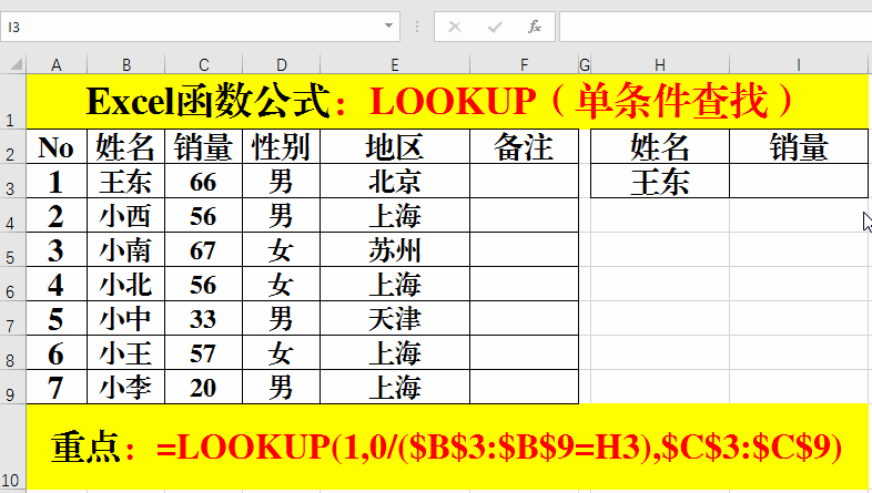 在目標(biāo)單元格中輸入公式:=LOOKUP(1,0/($B$3:$B$9=H3),$C$3:$C$9)。