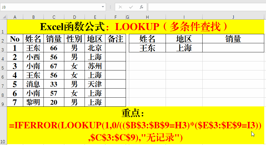 在目標(biāo)單元格中輸入公司:=IFERROR(LOOKUP(1,0/(($B$3:$B$9=H3)*($E$3:$E$9=I3)),$C$3:$C$9),"無記錄")。