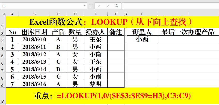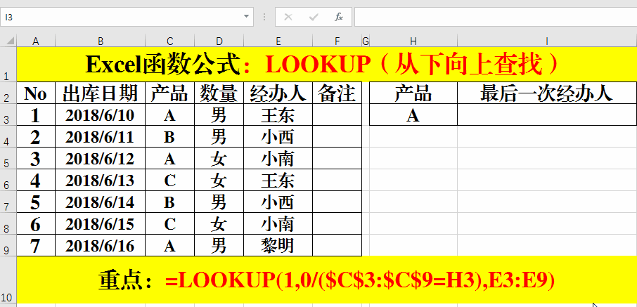在目標(biāo)單元格中輸入公式:=LOOKUP(1,0/($E$3:$E$9=H3),C3:C9)。