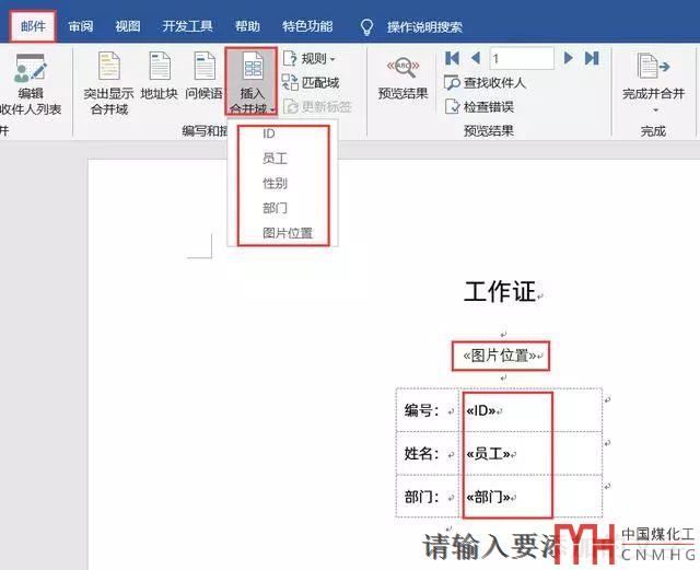 我們在郵件選項卡下,依次點擊插入合并域,把這項項目填入進去