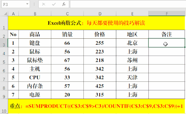 2、輸入公式:=SUMPRODUCT((C$3:C$9>C3)/COUNTIF(C$3:C$9,C$3:C$9))+1。