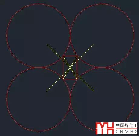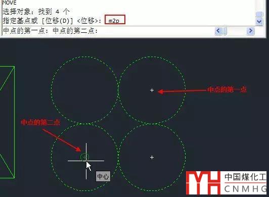 M2P的意思就是兩點的中點(Middle of 2 Points),可以將光標定位到拾取的兩個點之間連線的中點位置,以為這四個圓是中心對稱的,我們就沒有必要再連對角線找中心點了。