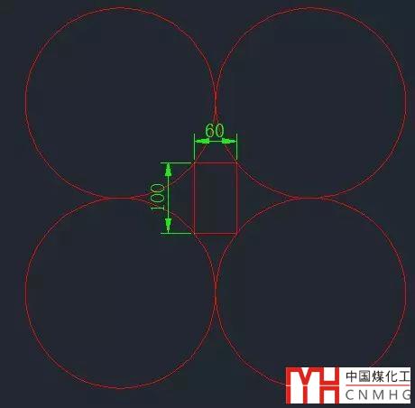 繪制如圖所示的圖形。要求中間的矩形尺寸為100×60。外面的四個圓相切。